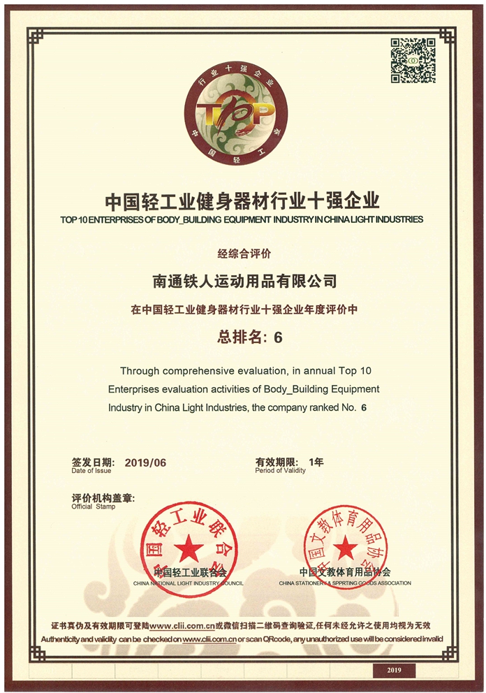 2019 | 2019中國輕工業(yè)健身器材行業(yè)十強企業(yè) | 中國輕工業(yè)聯(lián)合會、中國文教體育用品協(xié)會 |