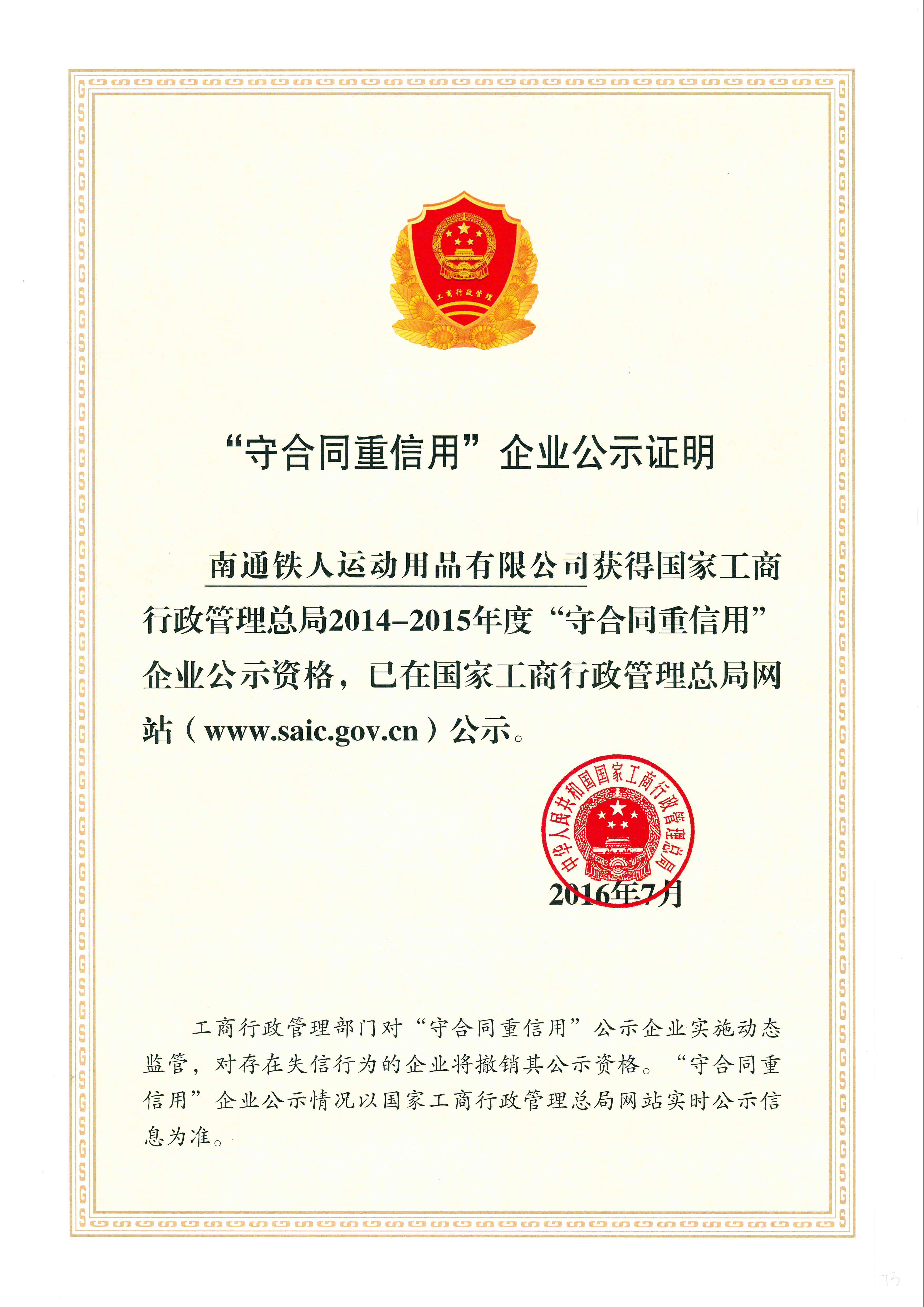 2015 | 全國“守合同重信用”企業(yè) | 國家工商行政管理總局 |